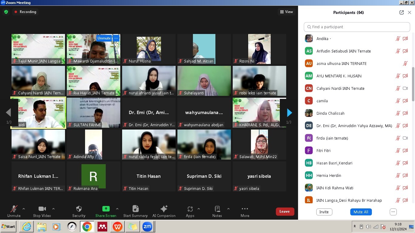 Pelaksanaan kuliah tamu melalui zoom meeting yang berlangsung tepat pada pukul 10.30 wit, dan diikuti oleh seluruh mahasiswa dan dosen BKPI; baik dari FTIK IAIN Ternate, maupun dari IAIN Langsa Aceh, serta para tenaga pendidik yang ada di kota Ternate.