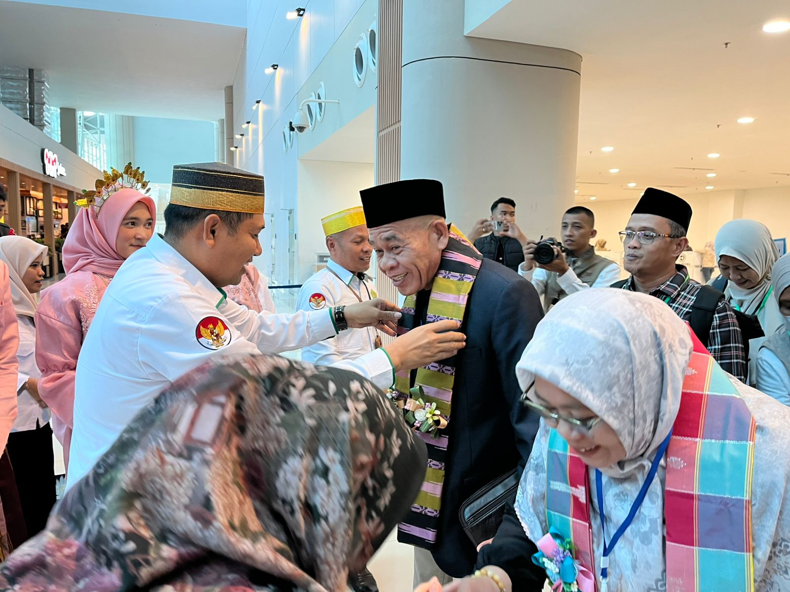 KONTINGEN Musabaqah Qira’atil Kutub Internasional (MQKI) Ke-1 asal Maluku Utara tiba dengan selamat di Bandara Internasional Sultan Hasanuddin Makassar, Selasa (30/9/2025). Suasana penyambutan berlangsung hangat dan penuh kesan sejak para peserta turun dari pesawat.