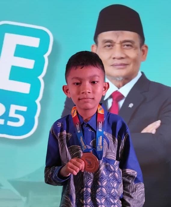 PERJUANGAN kontingen Olimpiade Madrasah Indonesia (OMI) asal Maluku Utara tahun ini membuahkan hasil membanggakan. Pada pengumuman yang disampaikan Kamis (14/11/2025), Faqih Abrizam Rivai, siswa MIS Fathul Munir Kota Ternate, berhasil meraih Medali Perunggu pada mata pelajaran Ilmu Pengetahuan Alam dan Sosial (IPAS) jenjang Madrasah Ibtidaiyah (MI).
