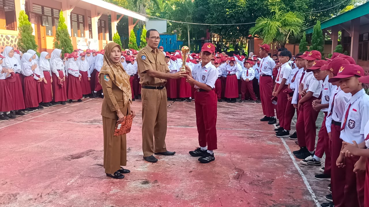Kepala Sekolah SDN 1 Kota Ternate Usman. S.P.d, beserta para guru menyerahkan piala kepada para pemain usai upacara hari senin sontak disambut meriah oleh para siswa.