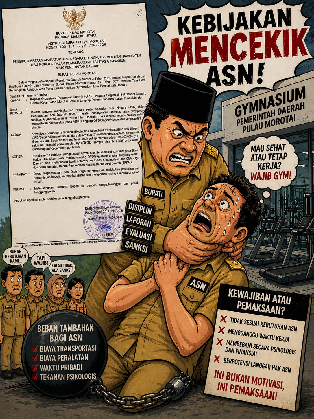 KEBIJAKAN Pemerintah Kabupaten Pulau Morotai yang mewajibkan Aparatur Sipil Negara (ASN) membayar iuran sebesar Rp200 ribu per bulan menuai kritik dari berbagai kalangan. Kebijakan ini tertuang dalam Instruksi Bupati Pulau Morotai Nomor 100.3.4.2/18/PM/2026 tentang pengikutsertaan ASN dalam pemanfaatan fasilitas gym (Fasilitas Olahraga) milik pemerintah daerah, Selasa (21/4/2026).